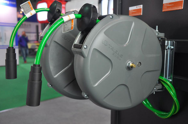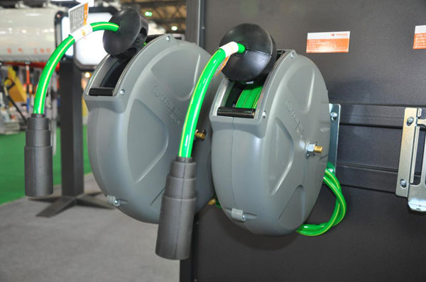 根據(jù)市場需求,本次展會還帶來了全新產品----烤房專用防靜電繞線器,軟管為日本原裝進口防靜電管線。眾所周知,在烤漆房里,油漆工在作業(yè)時易產生漆霧,一旦被烤房內產生的靜電火花引燃,極易引起火災導致重大安全事故;另外在噴漆時產生靜電,在油漆干之前會反吸灰塵及漆霧,影響噴漆效果。所以我們推薦烤房內使用防靜電繞線器,確保安全生產同時保證噴漆效果更佳。 如下圖: