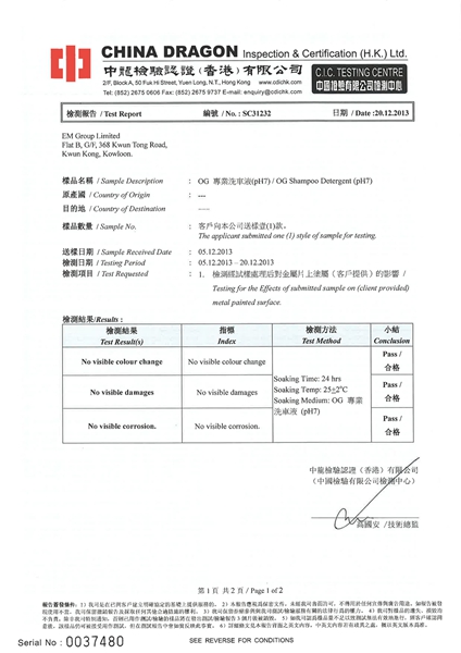 2、PH值中性,物料環(huán)保安全,對(duì)環(huán)境、車漆、輪胎、皮膚等無(wú)危害(附香港 機(jī)構(gòu)認(rèn)證圖)